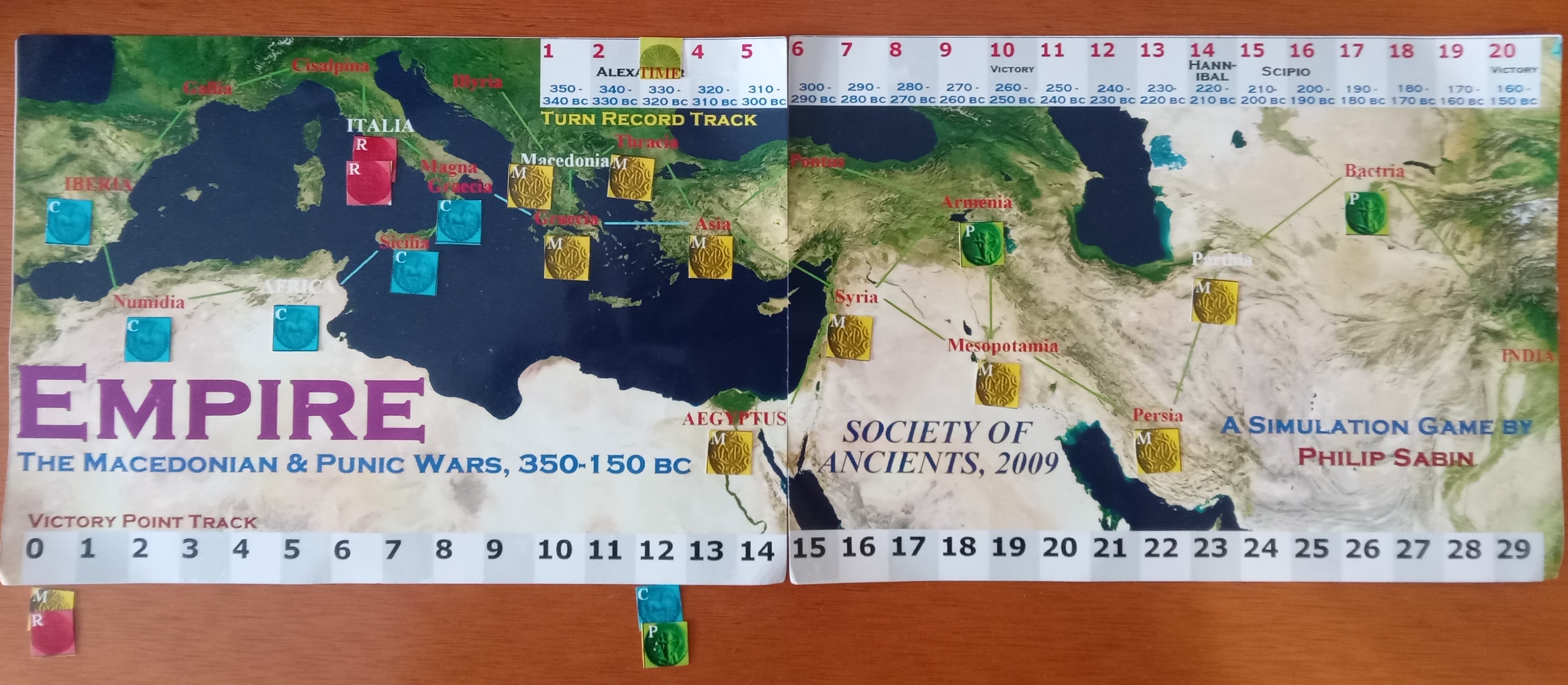 The auxiliaries, charged last turn in the flank by my central chariot squadron, are able to turn and flight the melee on more-equal terms as they are not otherwise engaged in fighting. My chariots roll one die per base as they no longer get bonuses for attacking from the flank and for being chariots in the first round of a melee. They score one hit, but the auxiliaries, thanks to fighting light chariots, get three dice for their one base, scoring two hits. However, I save both of them.